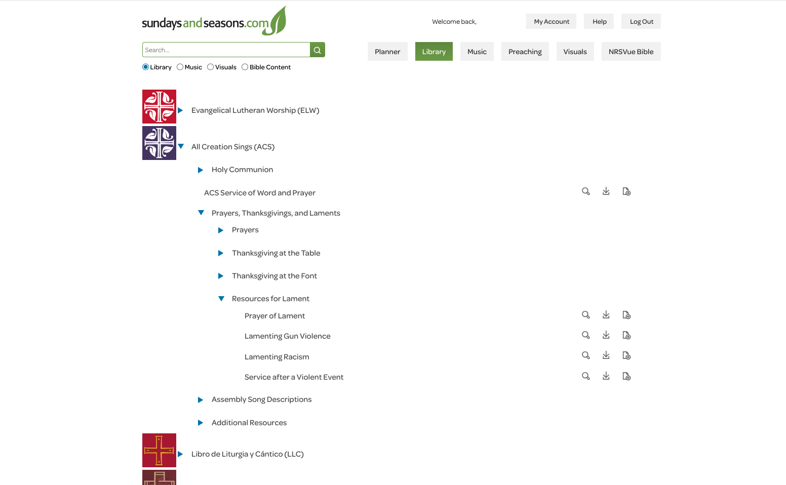 Sundays and Seasons subscribers have access not only to resources published in current and past Sundays and Seasons volumes but also to numerous prayers and services in All Creation Sings, Evangelical Lutheran Worship, and This Far by Faith, just to name a few. Hymns and songs are available from over twenty-five song collections!